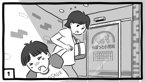 なんだか外が騒がしい様子…。クリニックの入り口で、お子様が親御様に手を引かれながらも、激しく嫌がっています。