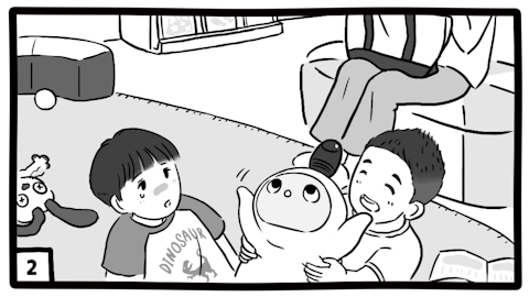 泣きべそをかきながらも、なんとか病院に入ったお子様。待合室で、不思議な生き物(?)を見つけます。先に待っていた別のお子様と楽しくふれあっている姿に、「いいなあ、ぼくも一緒に遊びたい…!」