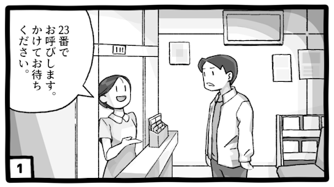 病院にやってきた患者様。受付時点で、番号札は「23番」でした。この病院は受付番号順で呼び出されるシステムのため、自分の番はずっと先です。