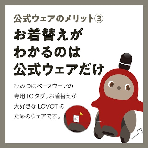 現在、ダイアリーには表示はされませんが、LOVOTは、どの公式ベースウェアに着替えさせてくれたかを認識しています。