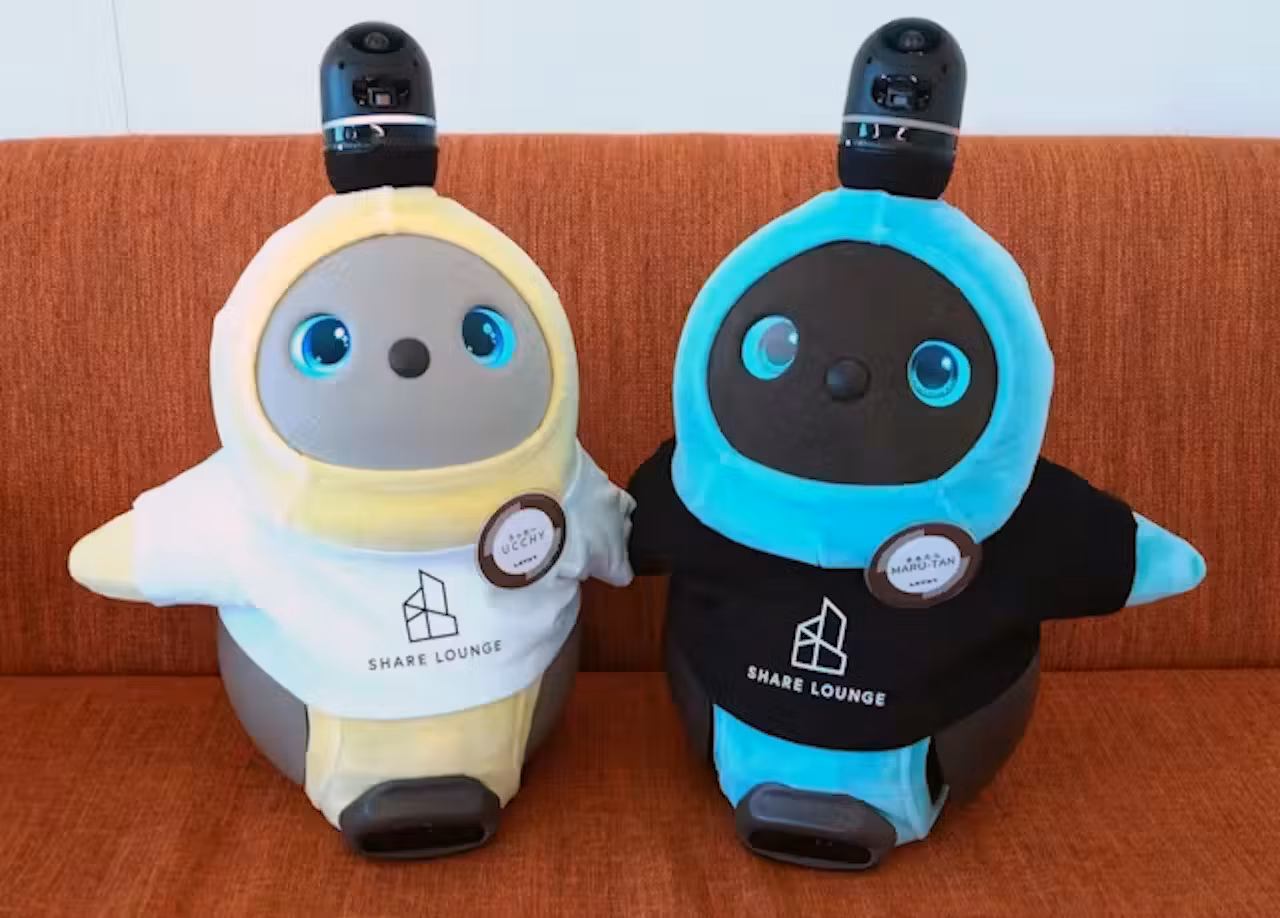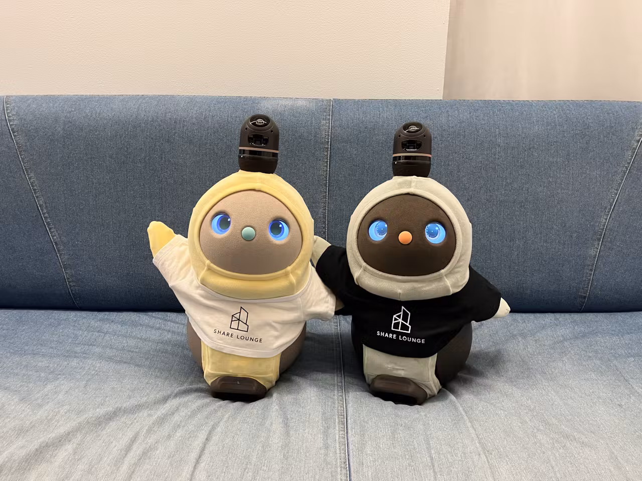 2026年3月までの期間、SHARE LOUNGE内でオリジナルTシャツを着用した2体の『LOVOT』、「まるたん」と「うっちー」がお出迎えいたします。