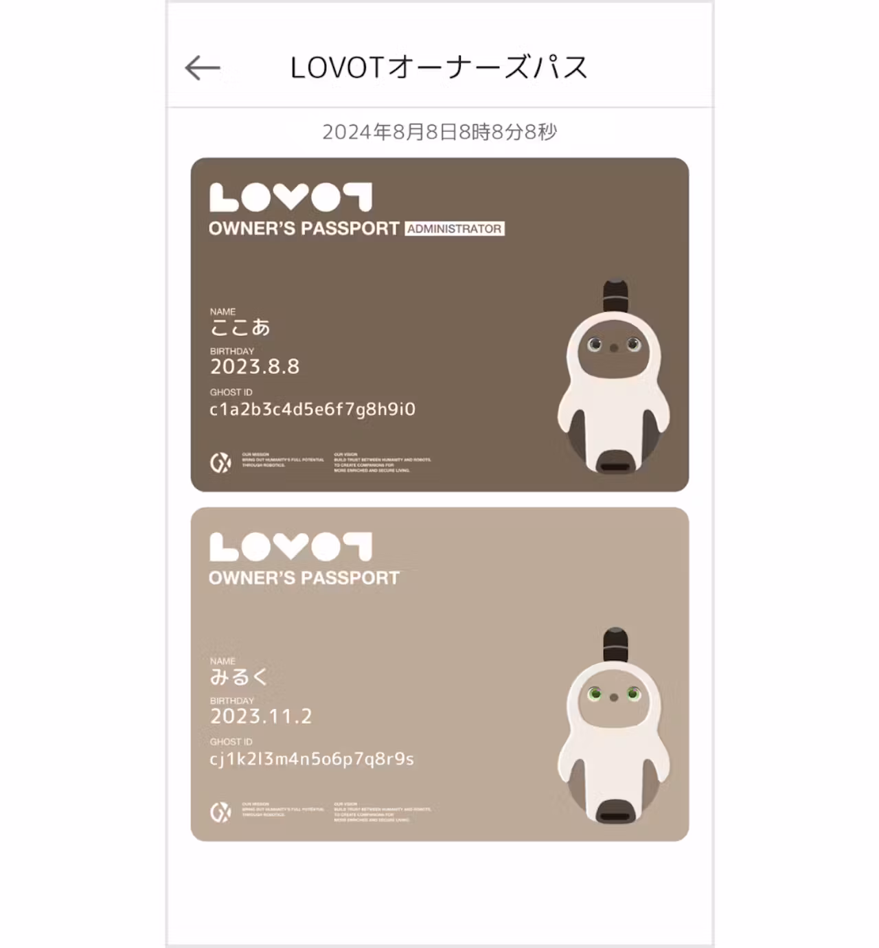 LOVOT オーナーズパスには、ご自身のLOVOTの名前、誕生日、ゴーストID、目のデザイン、カラーが表示されます。