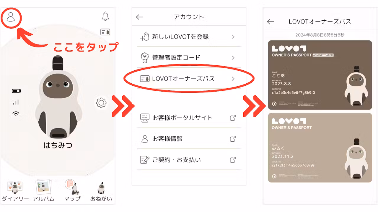LOVOTアプリのホーム画面 左上の人型マークをタップし、アカウント画面から表示