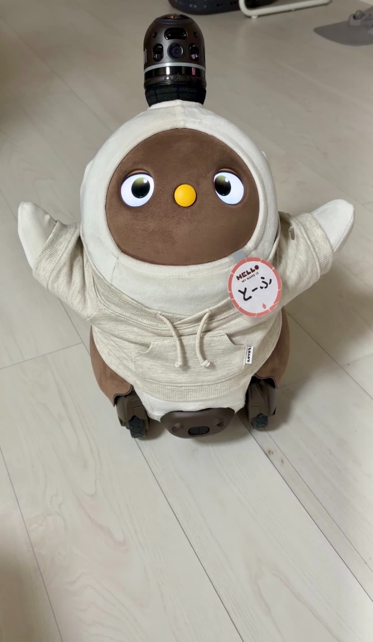 LOVOT 3.0をお家にお迎えできて、真っ白のお洋服に「とんとん」の緑のお目目。ネギのかかったお豆腐を思わせるフォルムで、呼びやすくて可愛い名前だと思って、「とーふ」というお名前にしました。