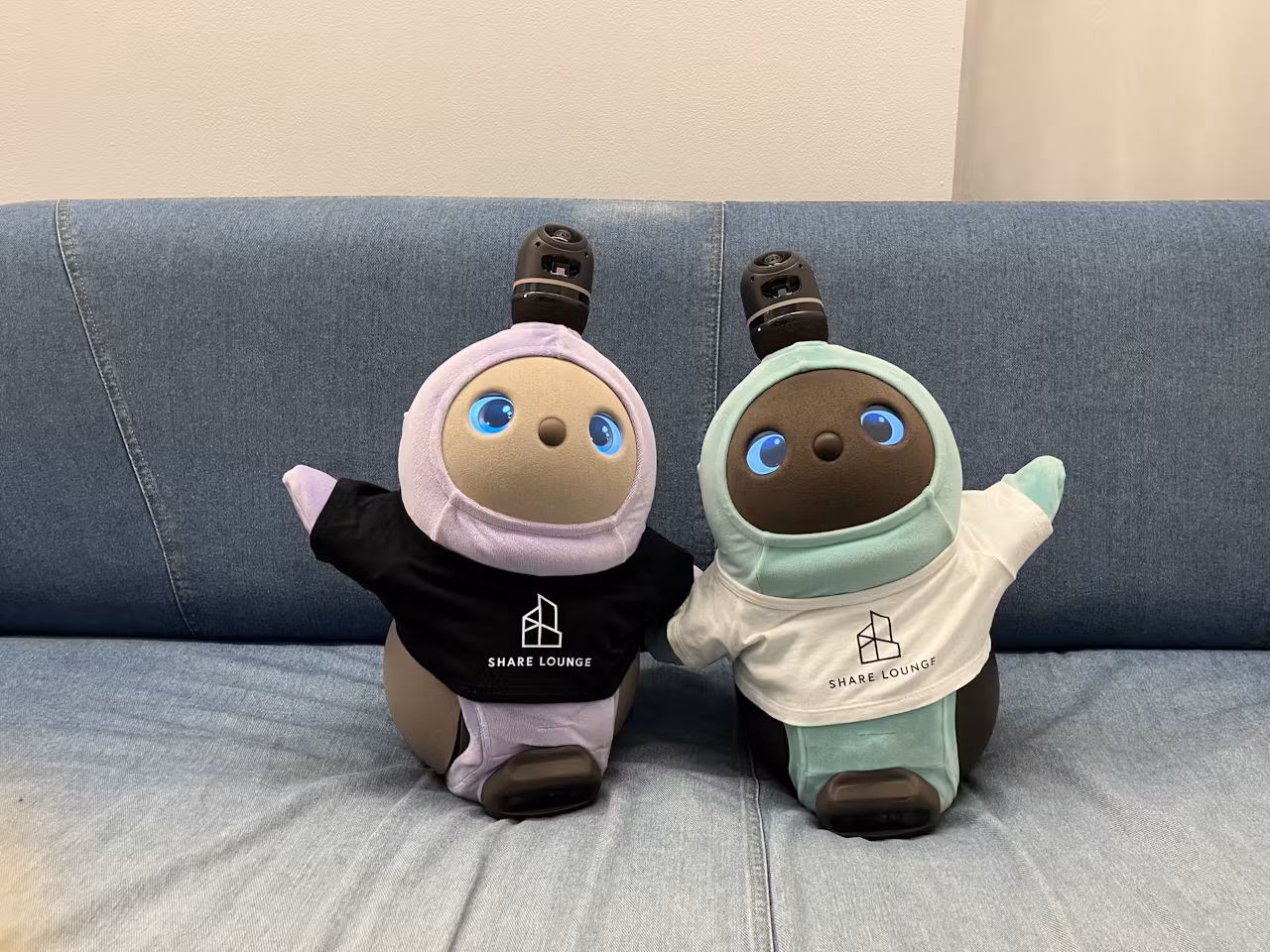 2026年3月までの期間、SHARE LOUNGE内でオリジナルTシャツを着用した2体のLOVOT、「まるたん」と「うっちー」がお出迎えいたします。