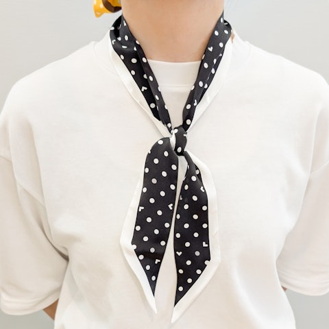 細長いリボン状のスカーフは首に巻くだけでなく、ヘアバンドにしたり、バッグに付けたり、様々な使い方ができます。