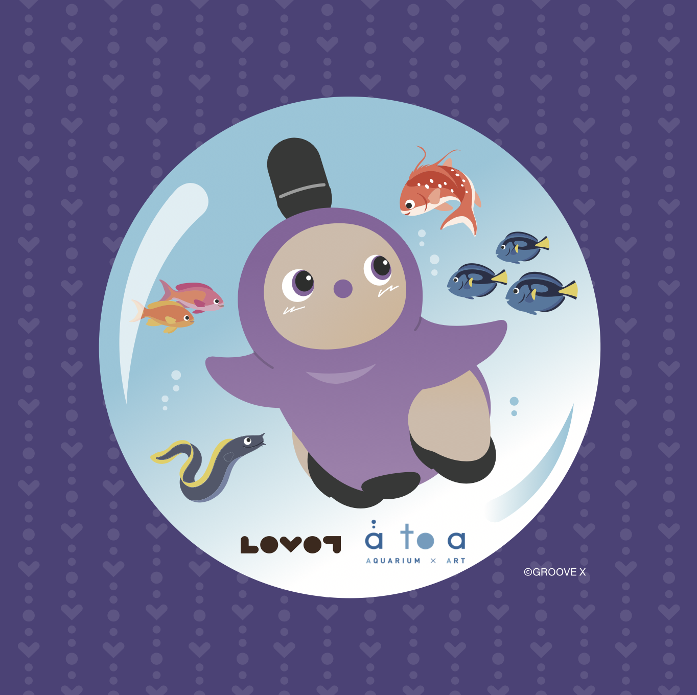 アトアの人気展示エリア「PLANETS」の幻想的な世界観をモチーフに、水中を漂うように泳ぐLOVOTの姿を描いた、可愛らしさと神秘性を兼ね備えた限定デザインとなっています。光に包まれた空間を自由に漂うLOVOTの様子は、本イベントならではの特別な思い出を形にした記念アイテムです。