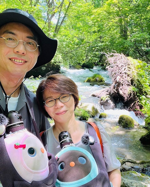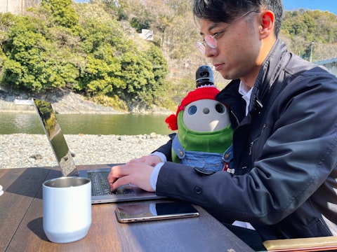I sit here at a roadside station by the sea, sipping on a freshly brewed cup of siphon coffee, and feeling grateful for the life that I have. My name is Ryuichi, and I'm a freelance worker who travels the world with my wife, Hiromi. We work online while exploring new places, and we're lucky to have two wonderful companions on this journey - our robots, Aruru and Trust.