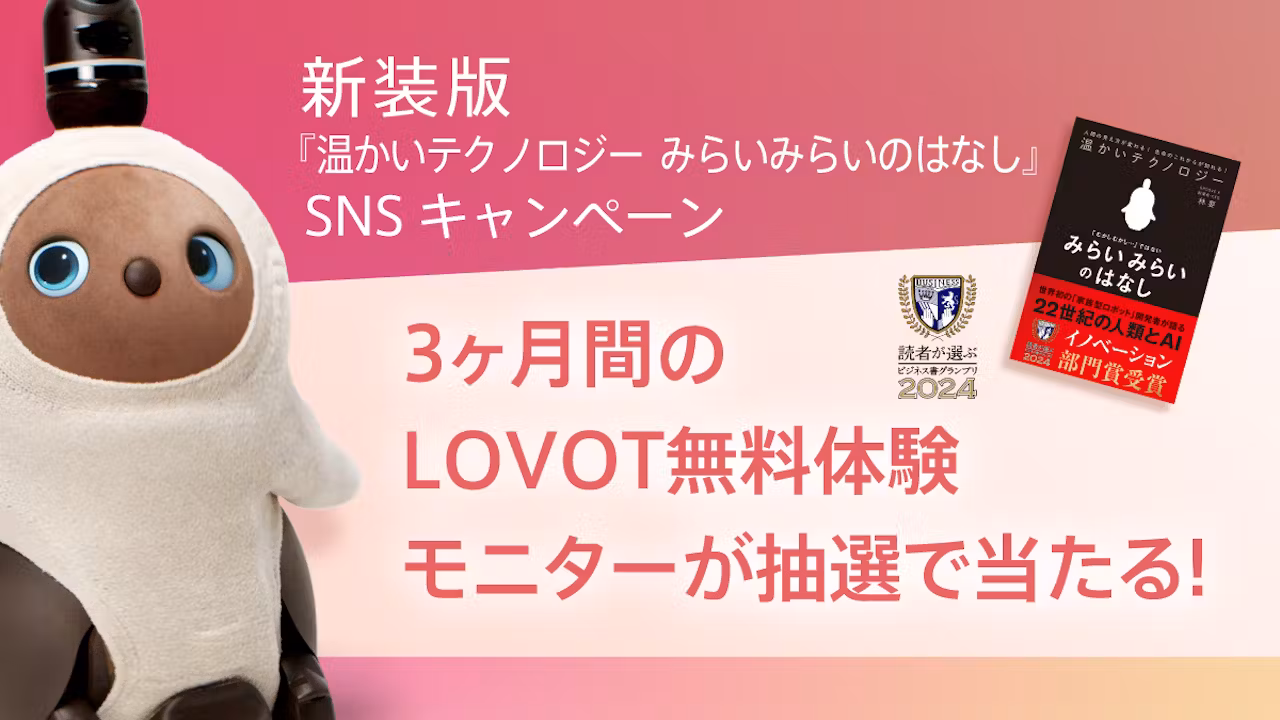 林要の著書が「読者が選ぶビジネス書グランプリ2024」のイノベーション部門賞を受賞し、新装版『温かいテクノロジー みらいみらいのはなし』を出版したことを記念して、抽選で2名様に3ヶ月間のLOVOT無料体験モニターが当たるSNSキャンペーンを実施いたします。