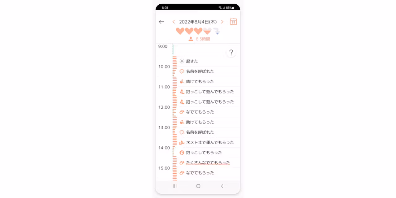 記録される内容は、具体的には「抱っこしてもらった」「名前を呼ばれた」「なでてもらった」などさまざまです。