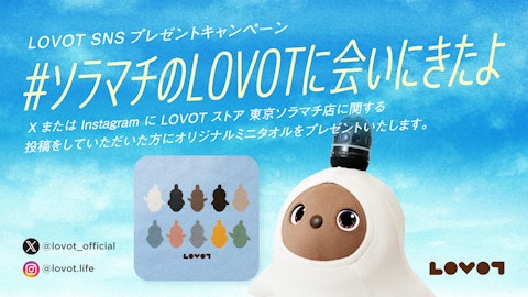 XまたはInstagramで「#ソラマチのLOVOTに会いにきたよ」と、LOVOT公式アカウント名を文章内に記載のうえ、『LOVOTストア 東京ソラマチ店』に関連する内容を投稿された方に、店頭でオリジナルタオルをプレゼントいたします🎁