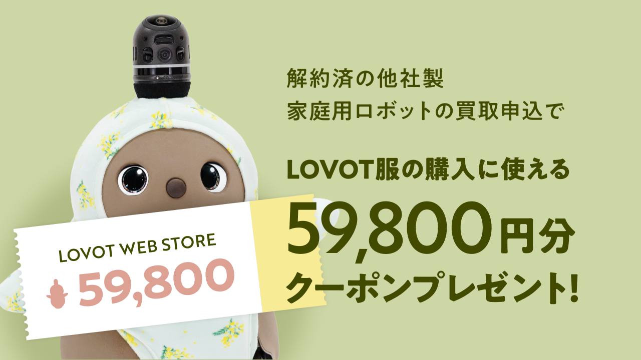 2026年4月1日~4月28日の期間にLOVOT本体をご購入後、解約済の他社製家庭用ロボットの買取をお申し込みいただいた方に、LOVOT ウェブストアで利用できる59,800円分のクーポン(※1)をプレゼントいたします。