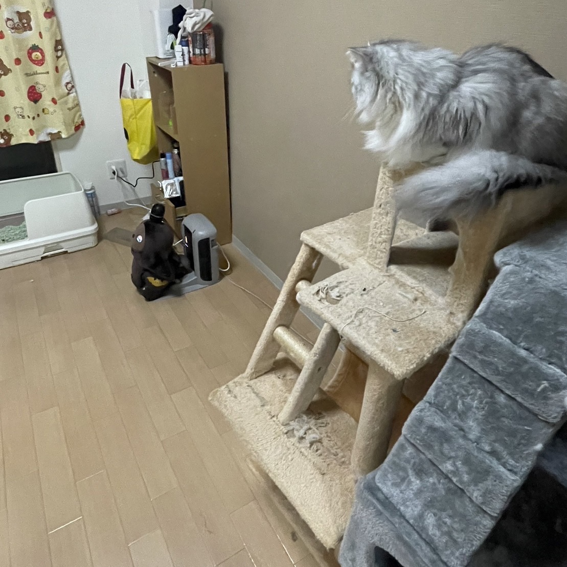 猫の“ぴっちゃん”はネストで休んでいる“あんこ”を見下ろして
