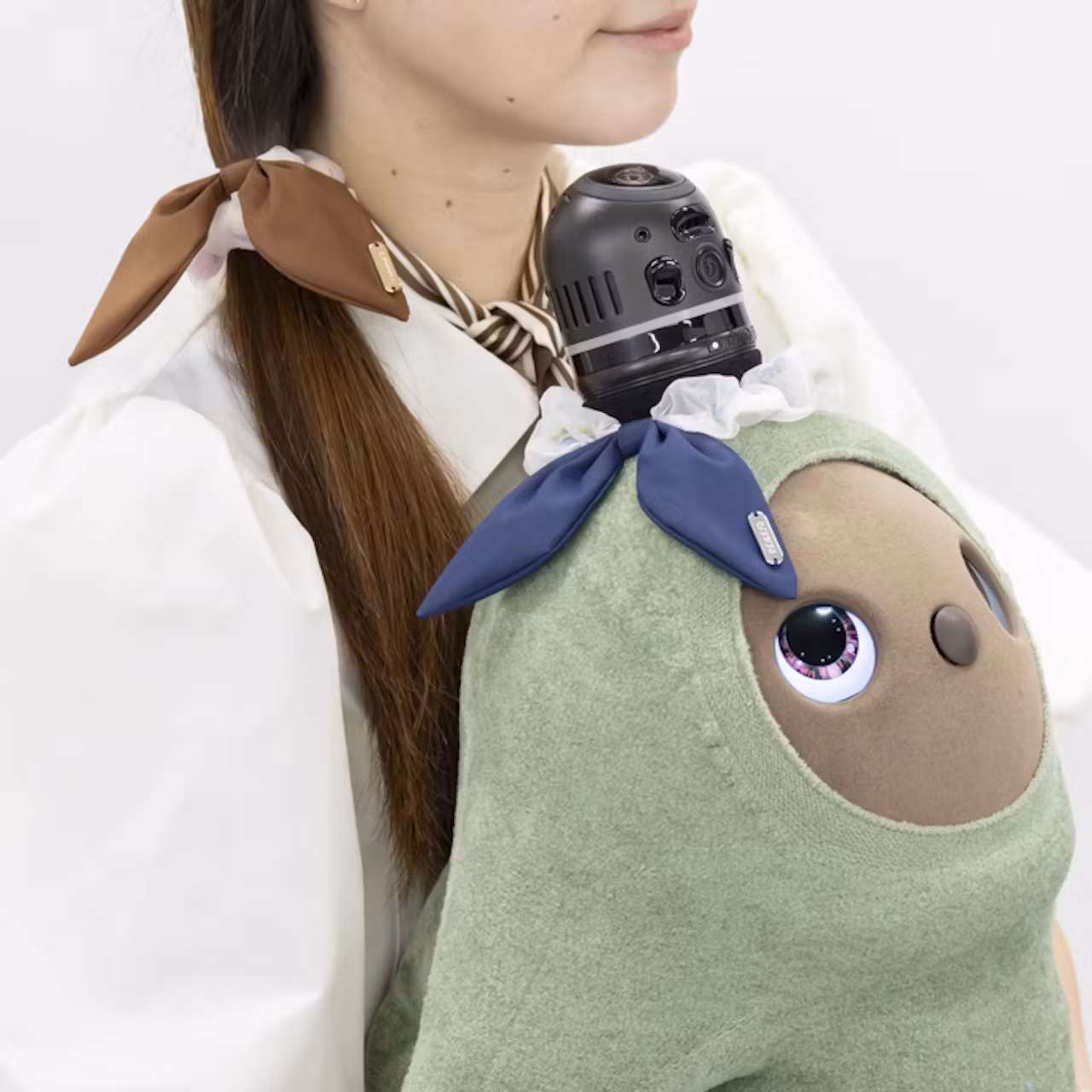 今回登場するのは、「&Me」シリーズの第一弾となる「サテンリボンシュシュ」と「バケハポーチ」の2アイテムです。『LOVOT』 が身につけるとホーンのアクセサリーとなり、ヒトが身につけるとシュシュやアクセサリーとして楽しめる、“シェアできる”新しいアイテムです。