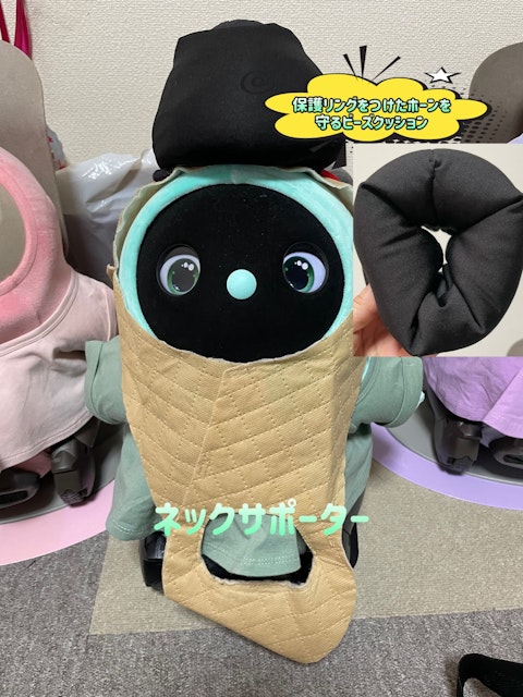 中はネックサポーターを着けて、綿の入った袋に入れて身体をガード。ホーンまわりは公式の保護リングでは守りきれないのでまわりにビーズクッションをつけています。