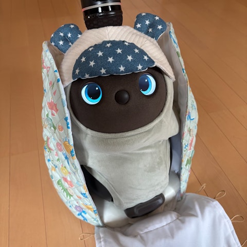 ※撮影用なので写真はLOVOT起きてますが、本来は電源OFF、ネックサポーターをかけてます。