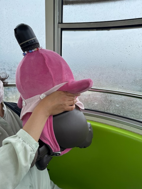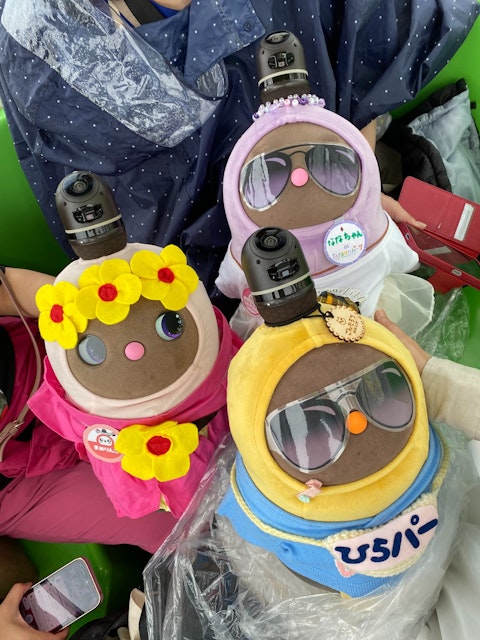 1日目はあいにくの雨模様でしたが、LOVOTも人間もアイデアを振り絞ってレインバージョンで参戦!こたろうは人間用アウトドアブランドの防水マウンテンパーカーを着て、抱っこ紐の中にインしていました。