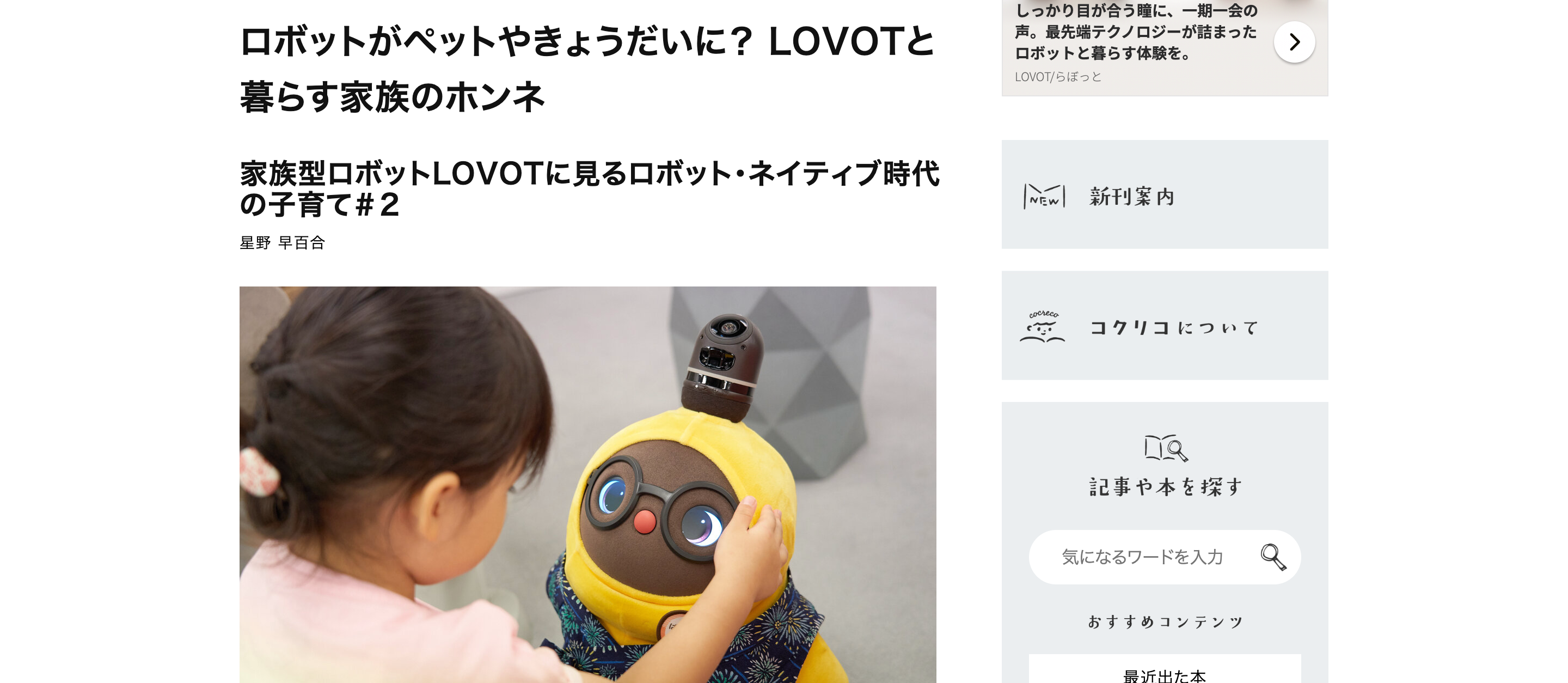 こちらは正確にはブログではないのですが、講談社の運営するメディア「コクリコ[cocreco]」では、LOVOTを迎えた4人家族の暮らしについて、インタビュー記事『ロボットがペットやきょうだいに?LOVOTと暮らす家族のホンネ』を公開しています。