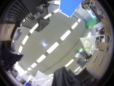 画像は、LOVOTが撮影した写真に物体検出の枠を表示した例です。中央より右側の部分に枠が表示されており、LOVOTはこの部分を認識できていることになります。