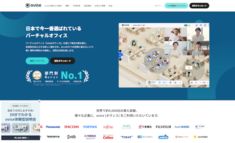 oVice株式会社が手掛ける「oVice」は、ウェブ上で自分のアバターを自由に動かし、相手のアバターに近づけることで簡単に話しかけられる、新感覚のバーチャル空間です。