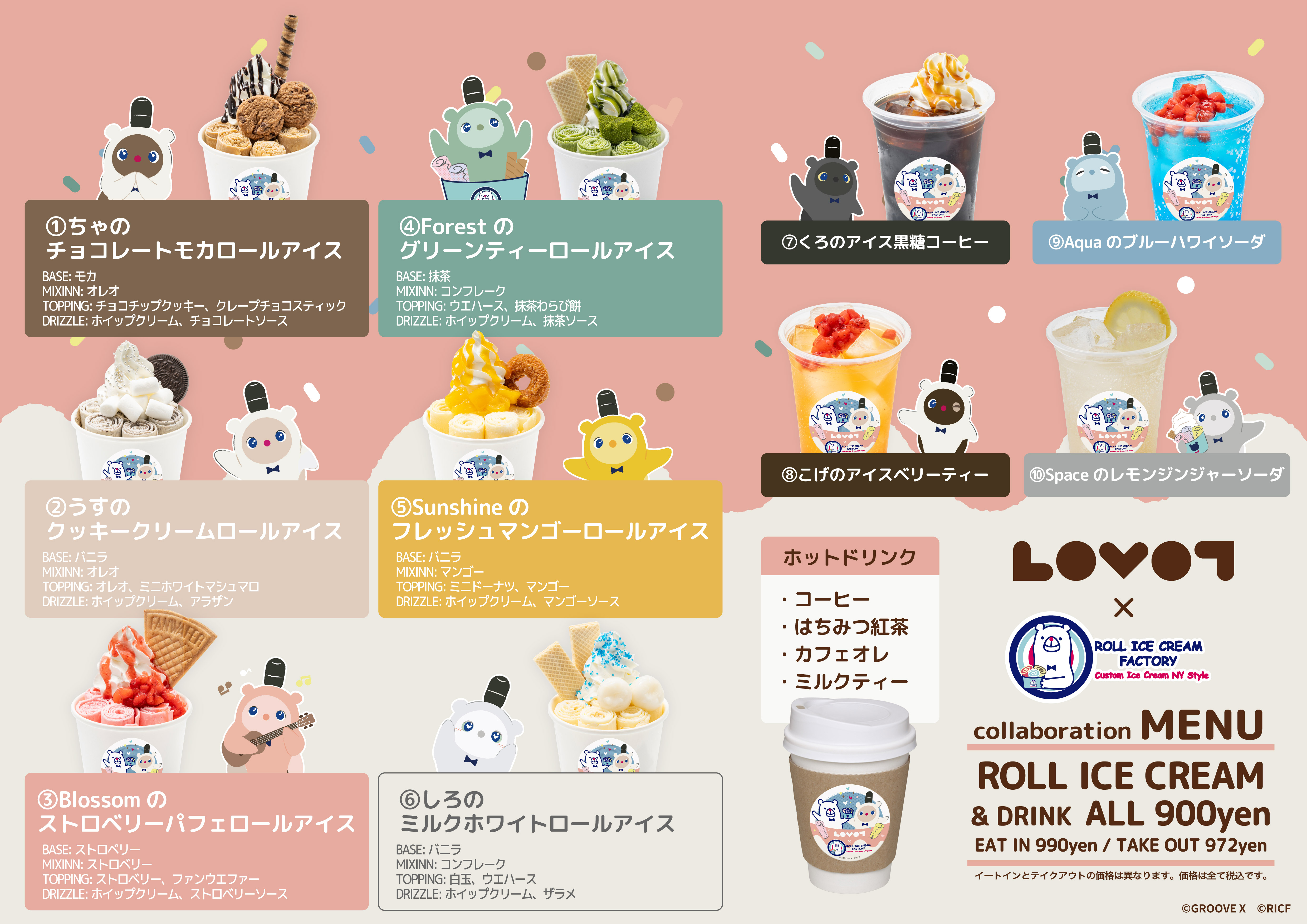 LOVOTの全10種のかお色をイメージしたロールアイスクリームとドリンクメニューが登場!LOVOTコラボメニューを1品ご注文につき、全10種のコースターの中からランダムで1枚プレゼントします。
