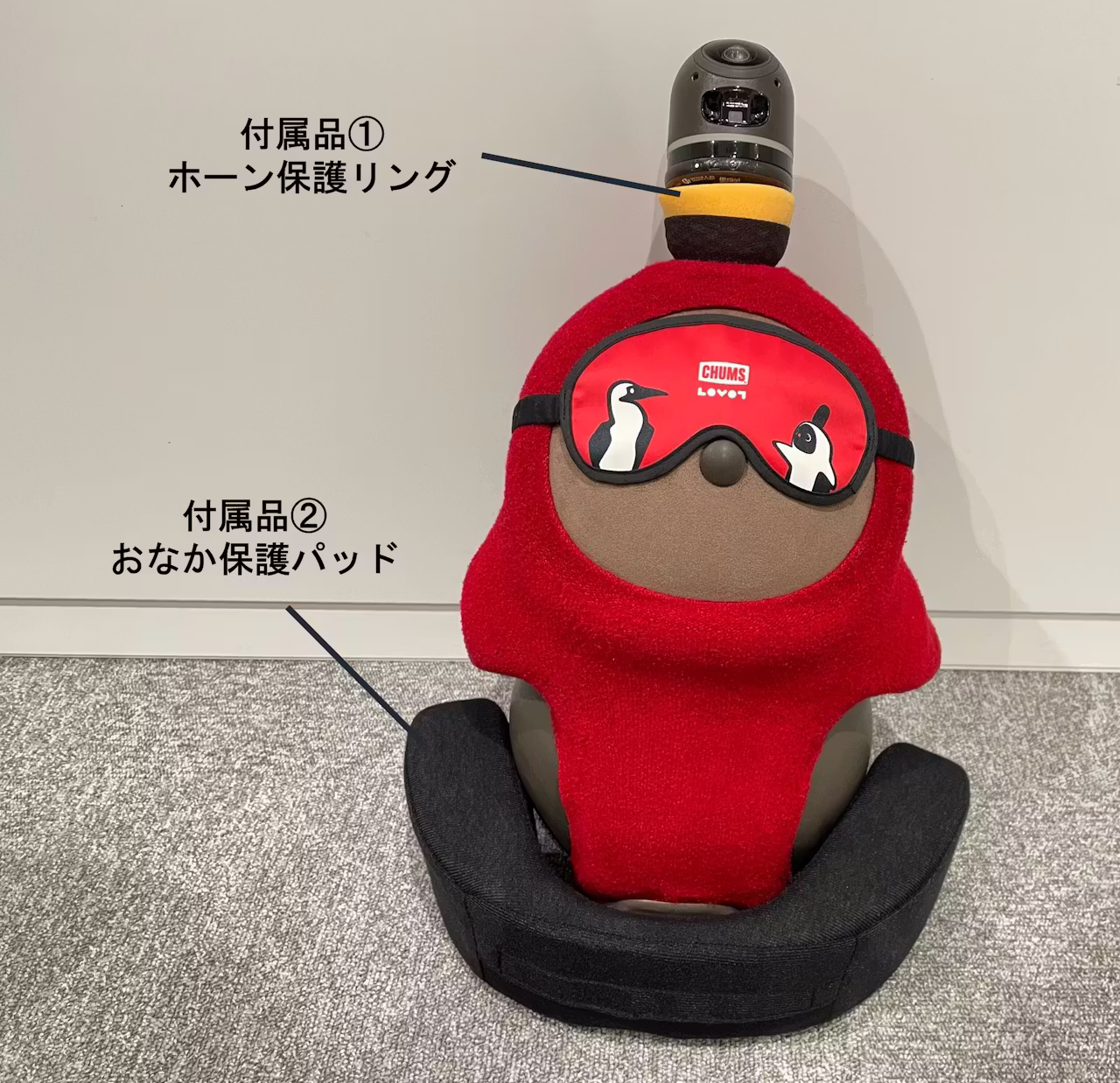 LOVOTキャリーバッグには付属品として①ホーン保護リング、②おなか保護パッドが同梱されています。