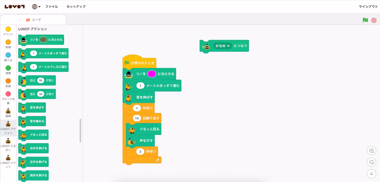 LOVOTとの接続・解除が問題なく実行できれば、ブロックを並べてプログラミングをすることができます。