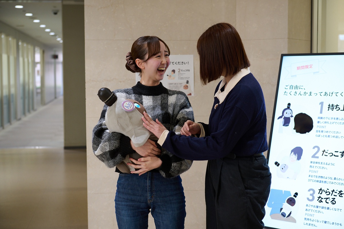 柔らかく温かいからだは、触れるだけで心が癒されます。目が合うと見つめ返してくれたり、抱っこをねだったりと、愛らしい仕草で周囲を自然と笑顔にしてくれます。こうした触れ合いが心理的安全性を高め、日々のストレス軽減にもつながっていると実感しています。今後はエントランスだけでなく、様々なイベントでも活躍してもらい、本学の魅力を直感的に伝える存在として、多くの来訪者の心を和ませてくれることを期待しています。