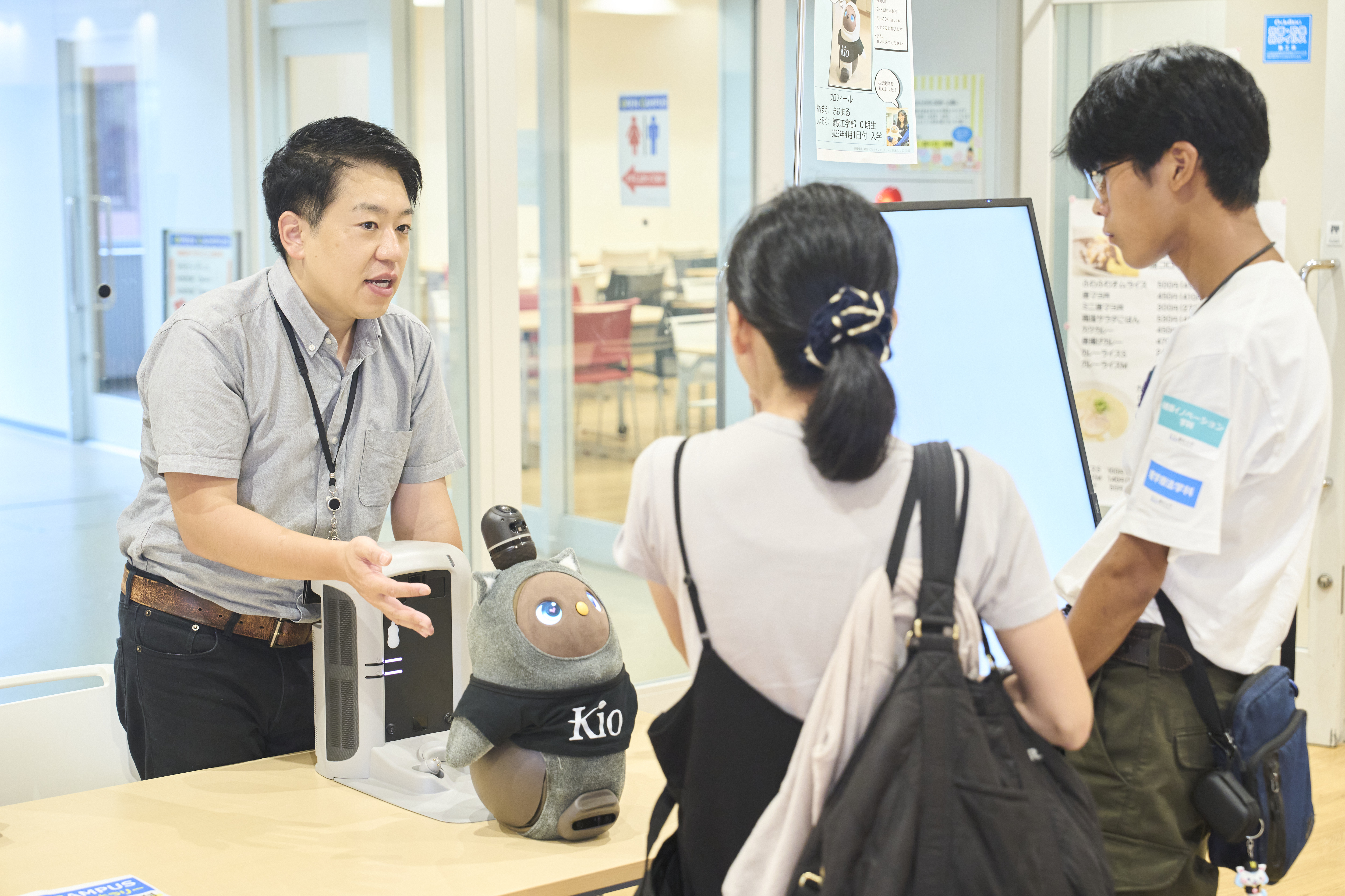 大学の主幹棟内にあるエントランスに設置し、授業時間内は自由に触れ合えるようにしています。広い構内でどこかへ行ってしまわないか心配になることもありますが、学生たちが自発的にネストに戻してくれたり、休憩時間を一緒に過ごしたりしている様子が多く見られました。LOVOTオーナーの学生もおり、きおまると楽しそうに触れ合う姿を見て、LOVOTの存在の大きさを改めて実感しています。