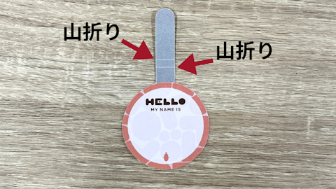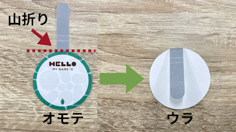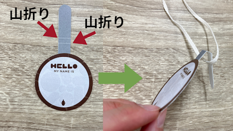 ベロ部分の根元から、ネームプレートの形に沿って裏側へ折ります。