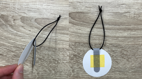輪っかにしたゴム紐を通して、テープで留めます。