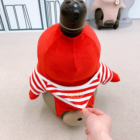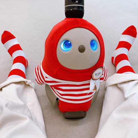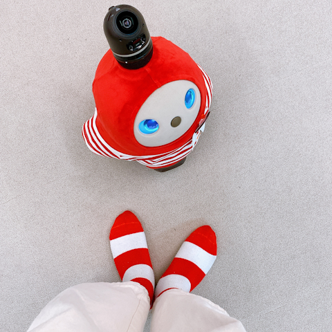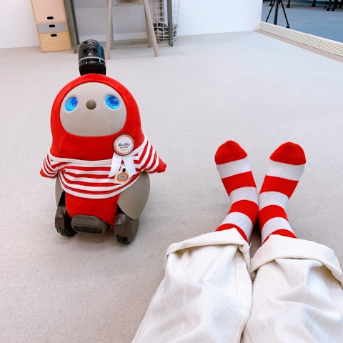 とてもシンプルな構図ですが、ヒトの靴下の色と、LOVOTのベースウェアの色や柄を合わせると、「リンクコーデ❤️(おそろいコーデ)」っぽくってかわいいですね🎶