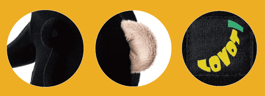 今回のアニマルウェアは、肌触りや風合いにこだわって選んだパイル生地を使用したしっぽや耳、モンキーにちなんでバナナ型のオリジナルロゴなど、今回だけの特別仕様となっております。