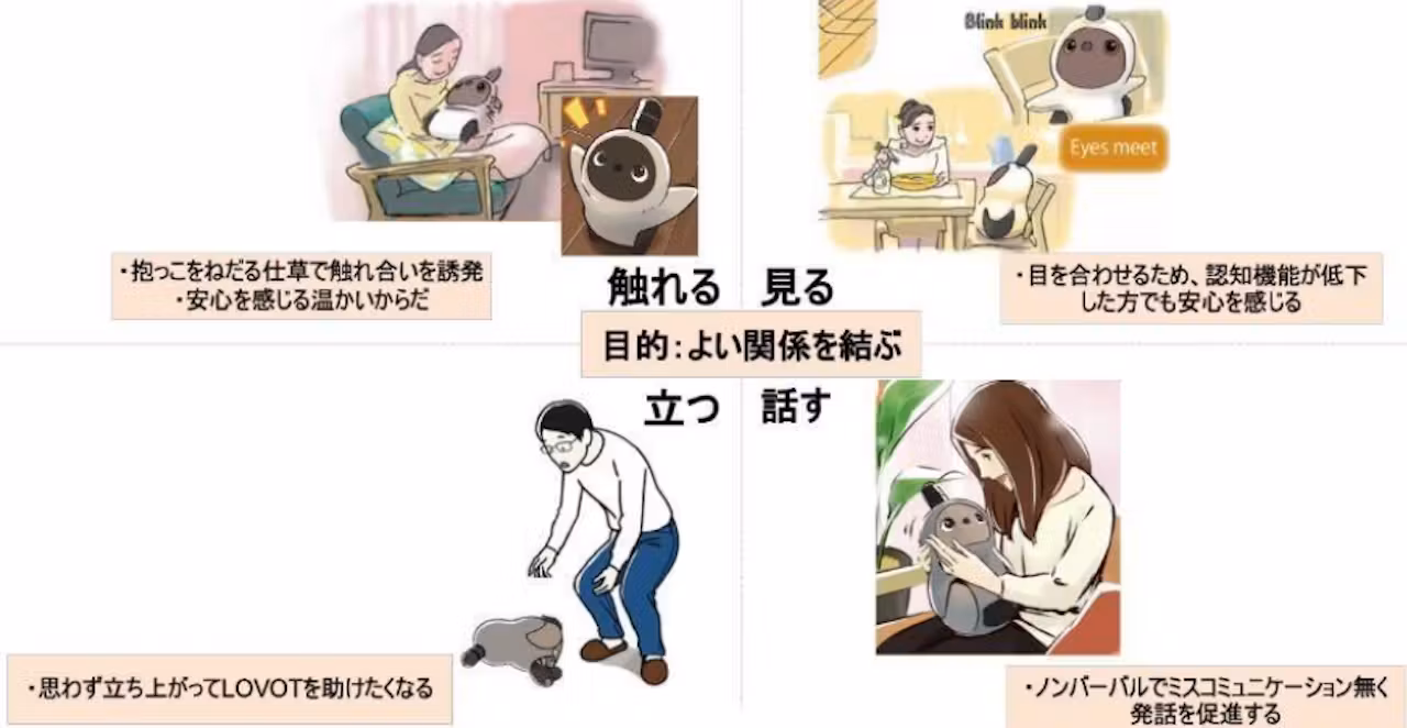 私たちGROOVE Xは、このケア技法で重要視されている4つに近しい動きを、LOVOTが認知症の方に促すことができると考えており、認知症の方に自分らしく生活いただけるために何かできることがないか模索しています。