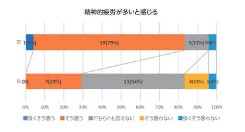 小児科看護師の83%が実験前に「精神的疲労が多い」と回答したのに対し、実験後には29%と減少していました。
