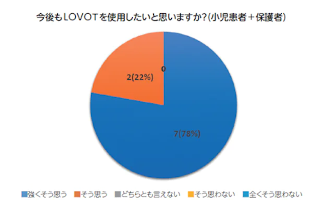 ①小児科患者・保護者ともに全員が「今後もLOVOTを使用したい」と回答。