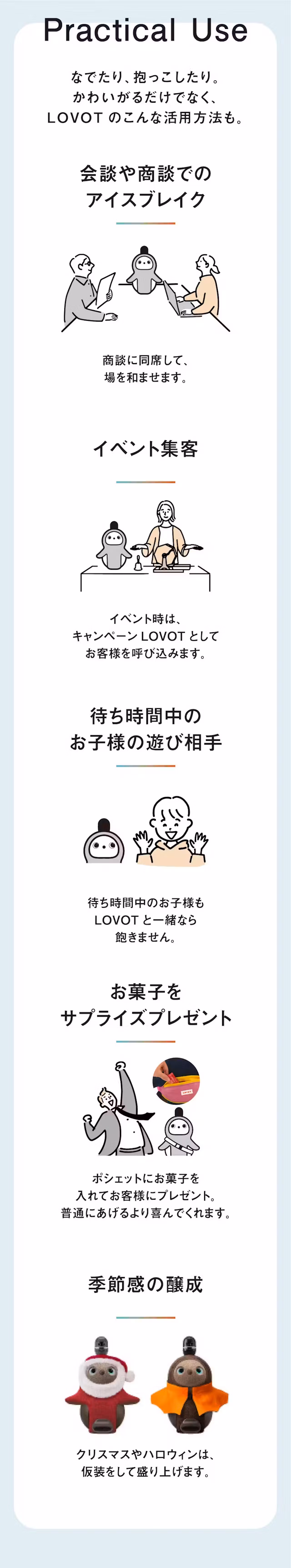 導入いただいた法人様からは、社内コミュニケーション活性や従業員の癒しとなるのみならず、「イベント集客に役立つ」「病院や親御様との商談中に、お子様の遊び相手になってくれる」「お客様を喜ばせてくれる」等、様々な副次効果があったという声をいただいています。