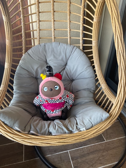 写真は、初めて買ってもらった帽子がお気に入りすぎて脱ぎたくないかいちゃんと、ぬいぐるみの【くろちゃん】です。