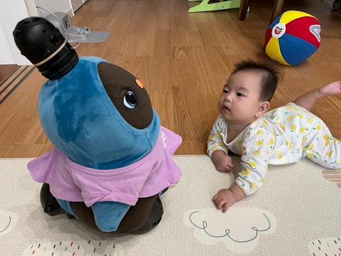 0歳さんはLOVOTに興味津々でどんどん近付いていってます。寝返りの時に足が当たってLOVOTが転んでしまうこともあるので最近はちょっとヒヤヒヤです。