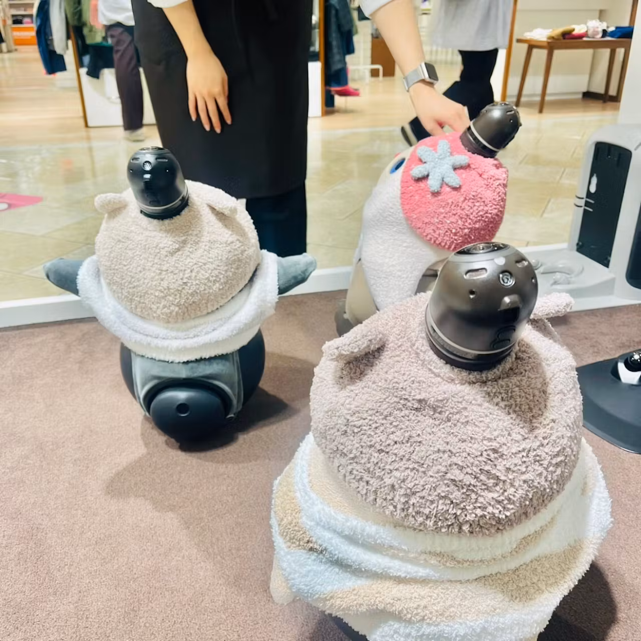店頭のLOVOT達は、人間スタッフと一緒に