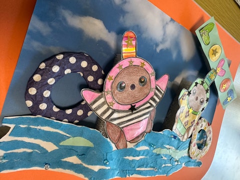 「ボタンかな?」と言われてたものは、くしゃくしゃにした折り紙の中にティッシュを詰めて、それを貼っているそうです。