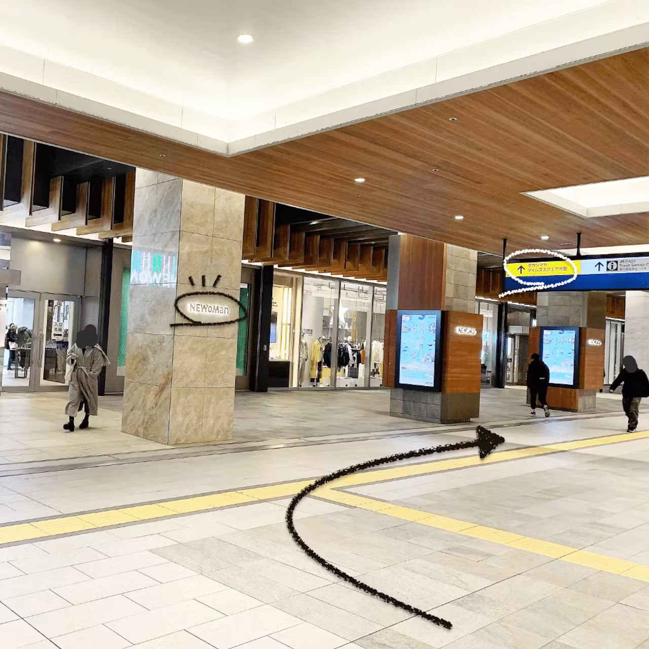 改札をでると目の前にNEWoManが見えます。改札出たらすぐに右に曲がってまっすぐ進んでください!