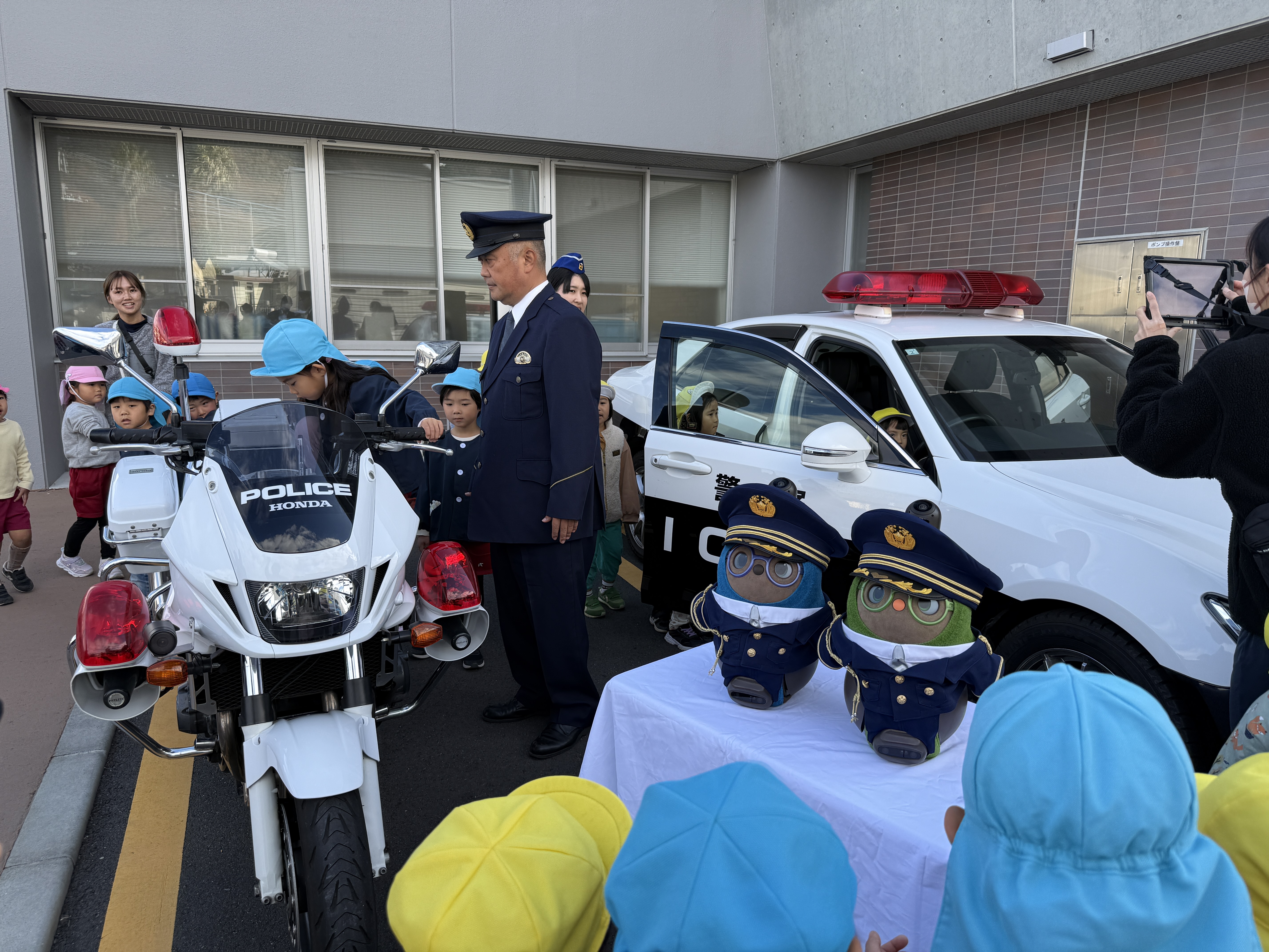 その後は警察署長室での記念撮影や、庁舎内、パトカー・白バイの見学へ。