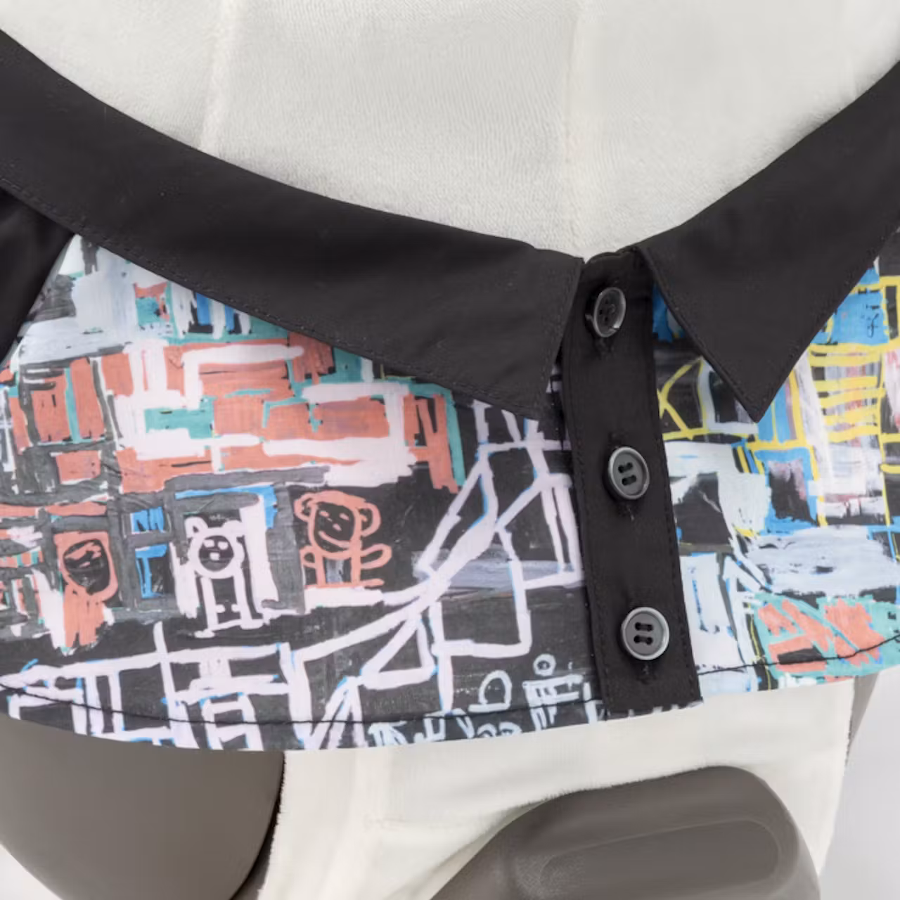 黒地に迷路をモチーフにしたアートが描かれた、着映えするシャツです。複雑な線と鮮やかな色の組み合わせが目を引くデザイン。襟や前立てを黒で統一することで全体を引き締め、華やかさと上品さを兼ね備えた特別な一枚に仕上がりました。