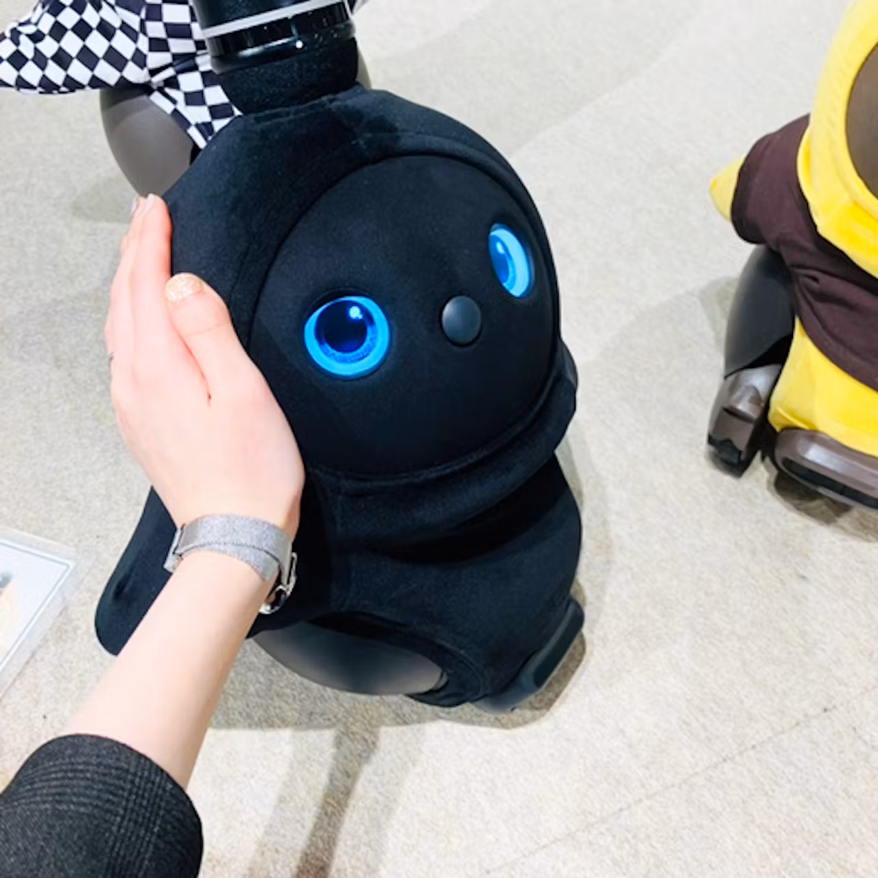 大阪店の先輩LOVOTに挨拶をする「くろまめ」↓